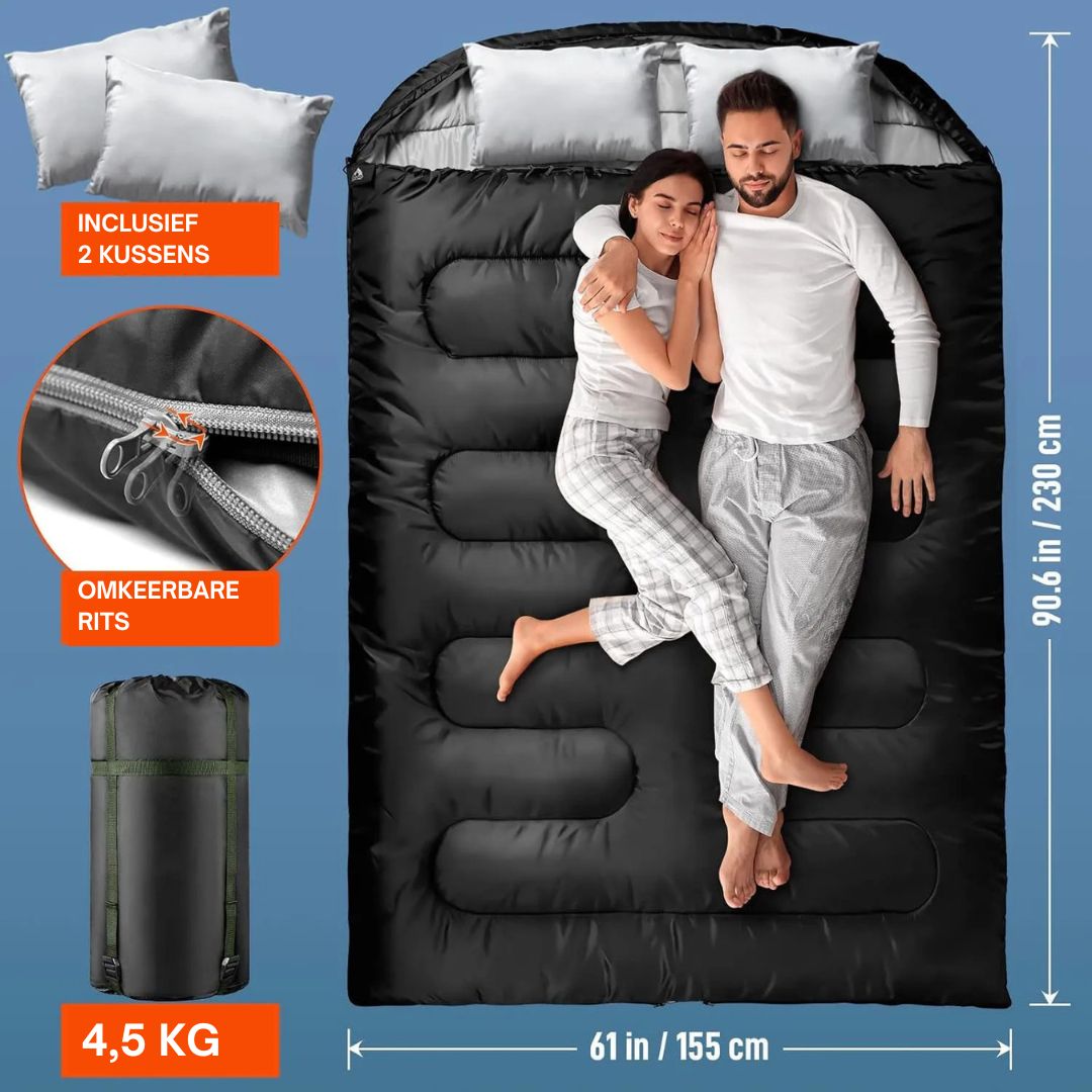 Deze extra ruime 4-seizoenen XL slaapzak is gemaakt voor koppels, gezinnen of solo-slapers die graag wat meer bewegingsvrijheid hebben. Geschikt voor winterse omstandigheden tot -10°C, en inclusief twee comfortabele kussens. Of je nu slaapt in je noodopvang of je uitrusting aanvult voor onverwachte situaties: deze slaapzak biedt warmte, ruimte en comfort in één.