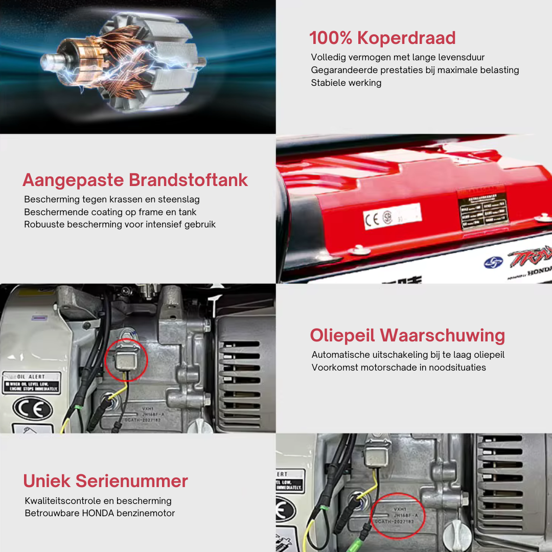 Deze generator is uitgerust met de betrouwbare HONDA GX390 benzinemotor (389cc), bekend om zijn duurzaamheid, prestaties en lage onderhoudskosten.
