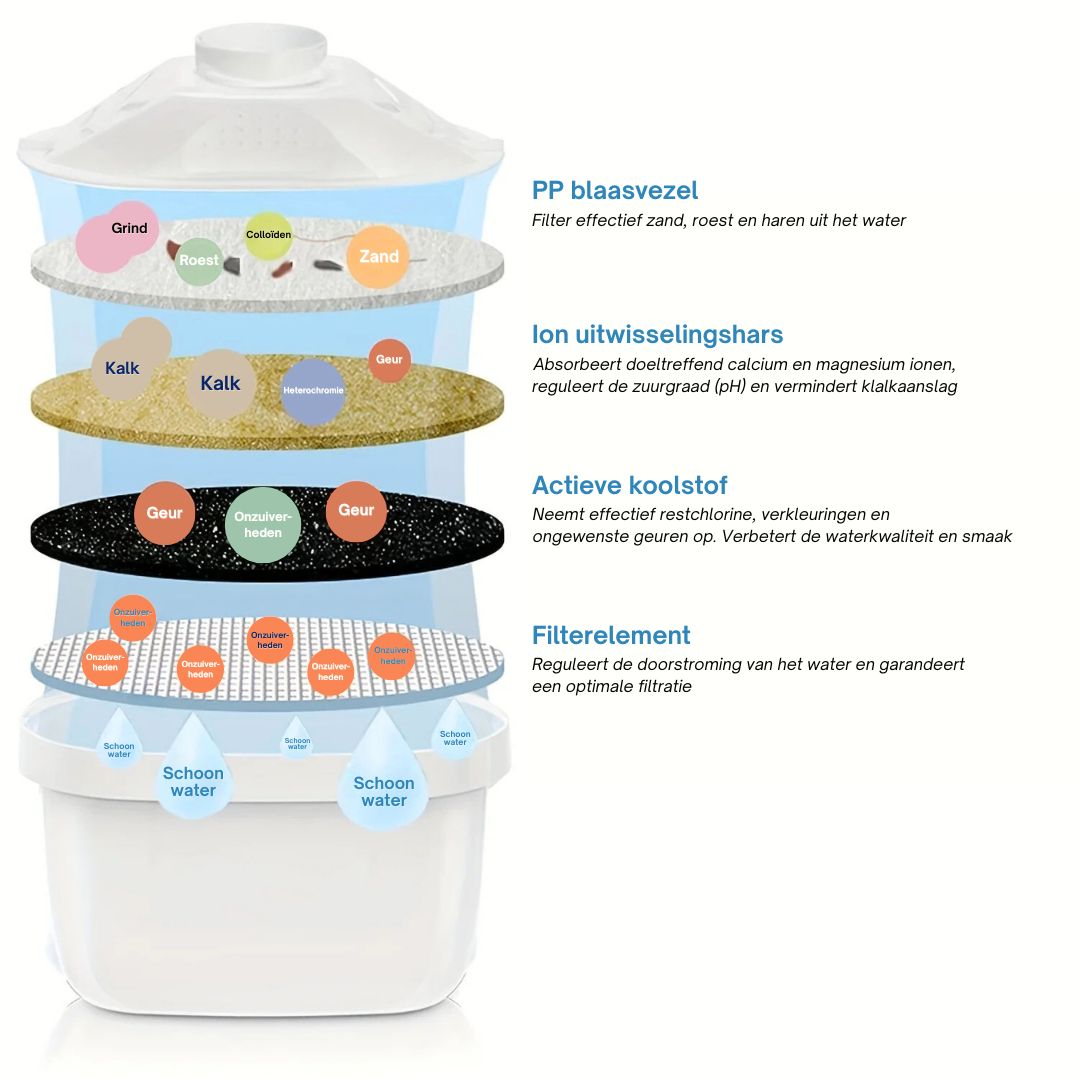 Het filtersysteem maakt gebruik van geactiveerde koolstof met een alkalische werking. Hierdoor worden schadelijke stoffen, chloor, geur en smaak uit kraanwater verwijderd voor een frissere smaak.